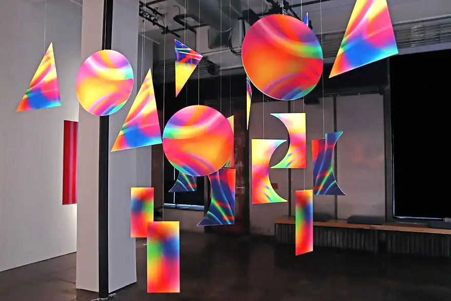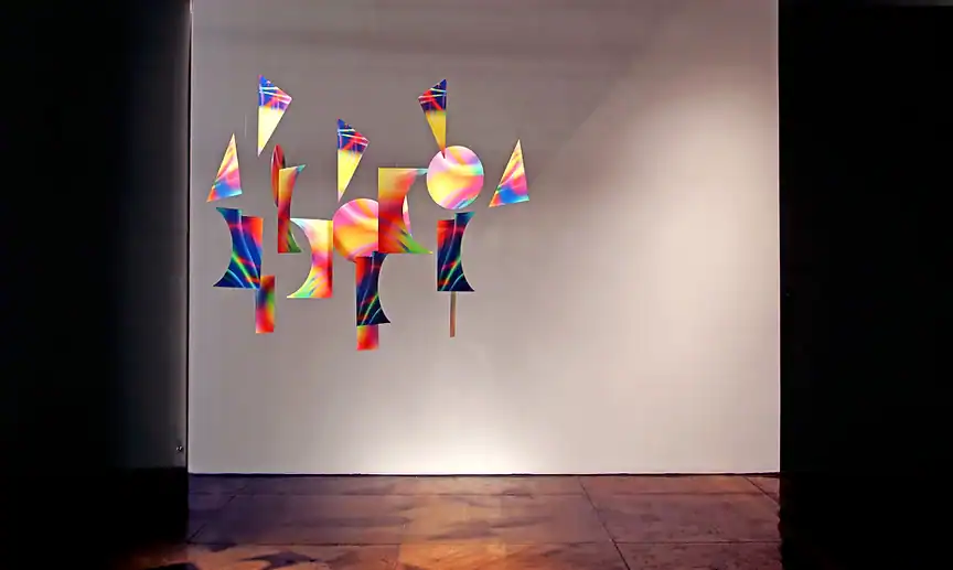“The sculpture to the left (Empty Space Inside an Argument 2019) consists of three sets of six shapes, on which photographs of light captured with hand-made lenses between reflective surfaces have been printed. The shapes are the empty spaces between letters in the argumentative repetitive words, NOTNOTNOT. Space inside an argument exists beyond our fixation with fear, anger and aggression. In an argument, empty space, silence and bliss exist between words and action and are often an unnoticed through line obscured from consciousness by our attention to a desired outcome. These silences and spaces contain intelligence beyond the self, connected to endless empty space.”
