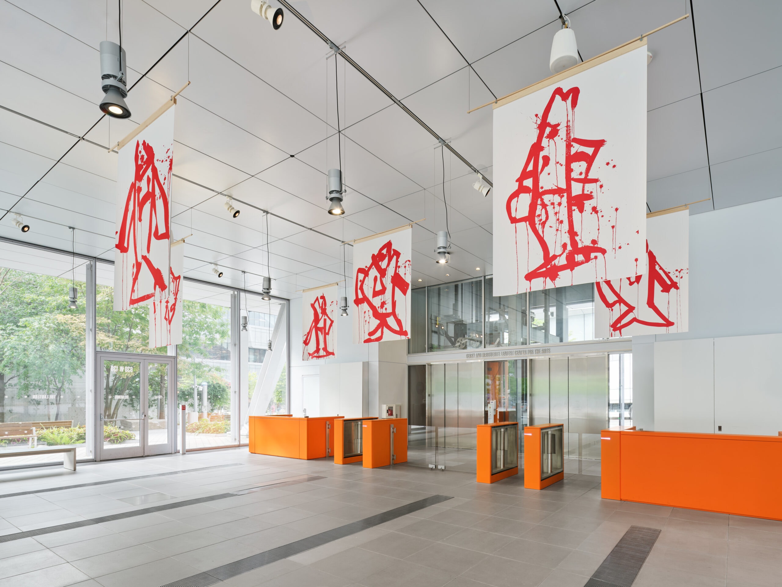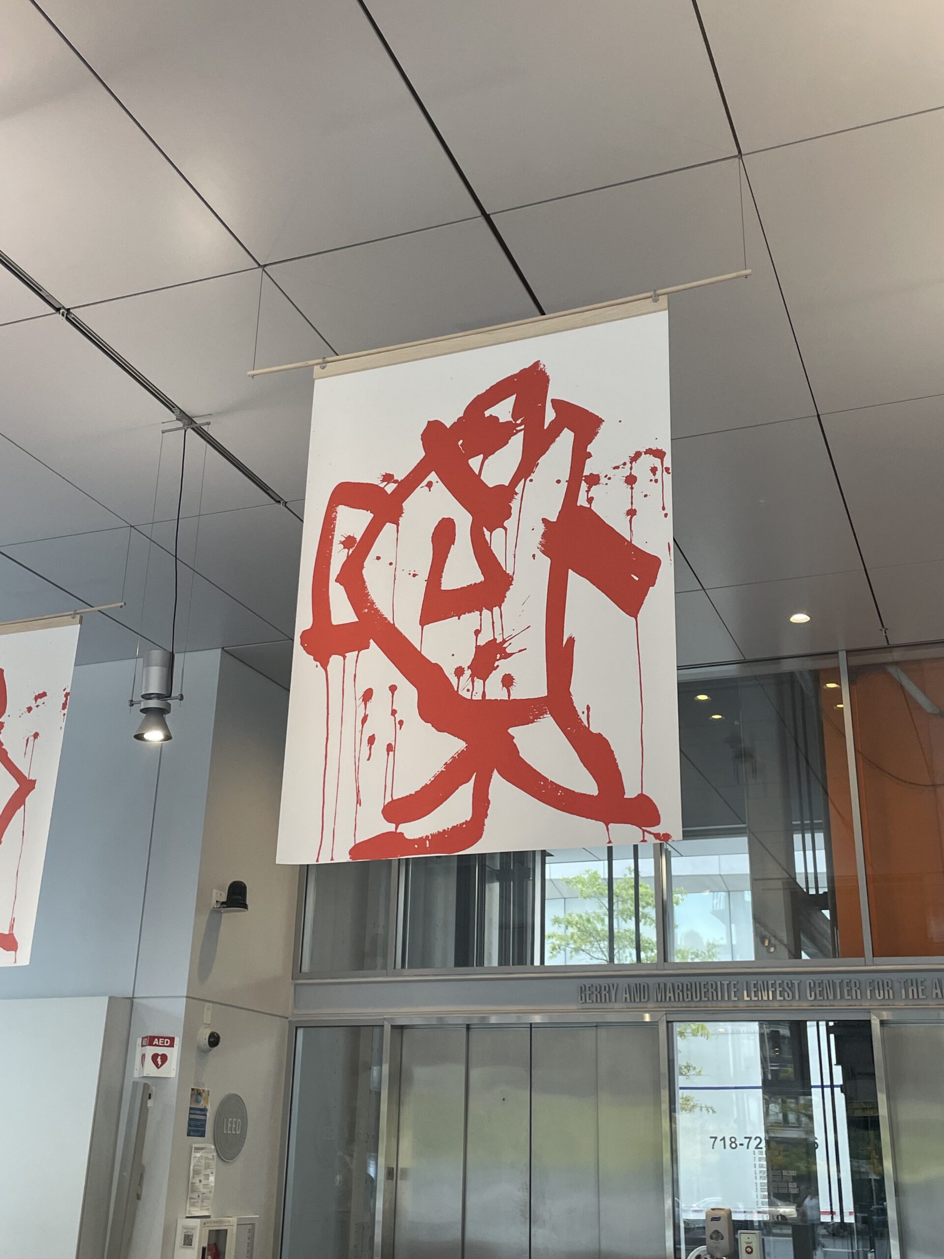 Jonas’s work engages with science and stories of the ocean. By enlarging her ink drawings into banners, the installation establishes a striking visual presence in the lobby. When we entered the Lenfest Center for the Arts lobby, a school of bright red fish floated above from wooden rods, subtly ebbing and flowing as we moved around the space.